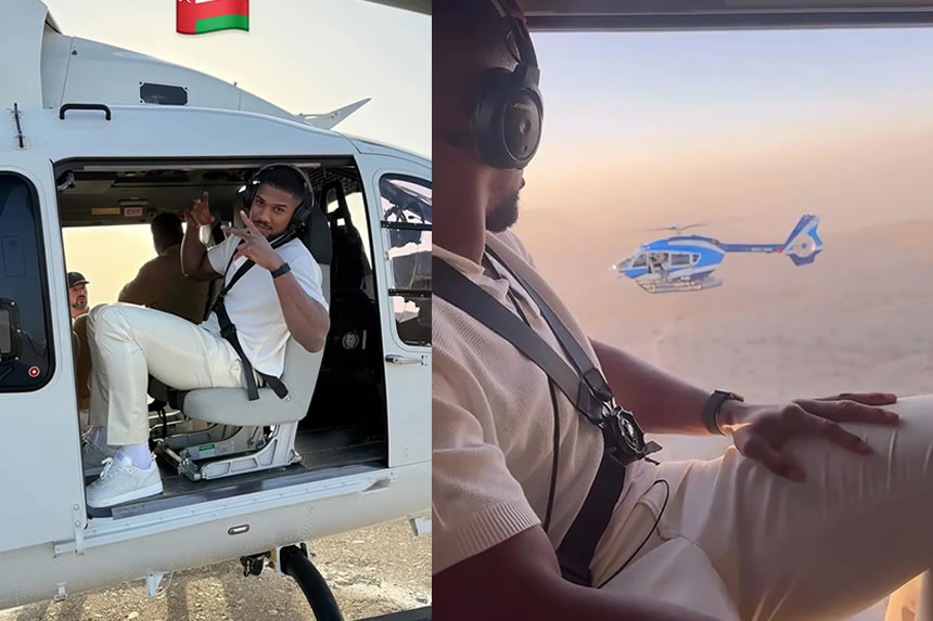 Alipiga picha akiwa ametazama kamera kwa vidole viwili huku video ikimwonyesha akiangalia jangwa la Oman pembeni kukiwa na helikopta nyingine.