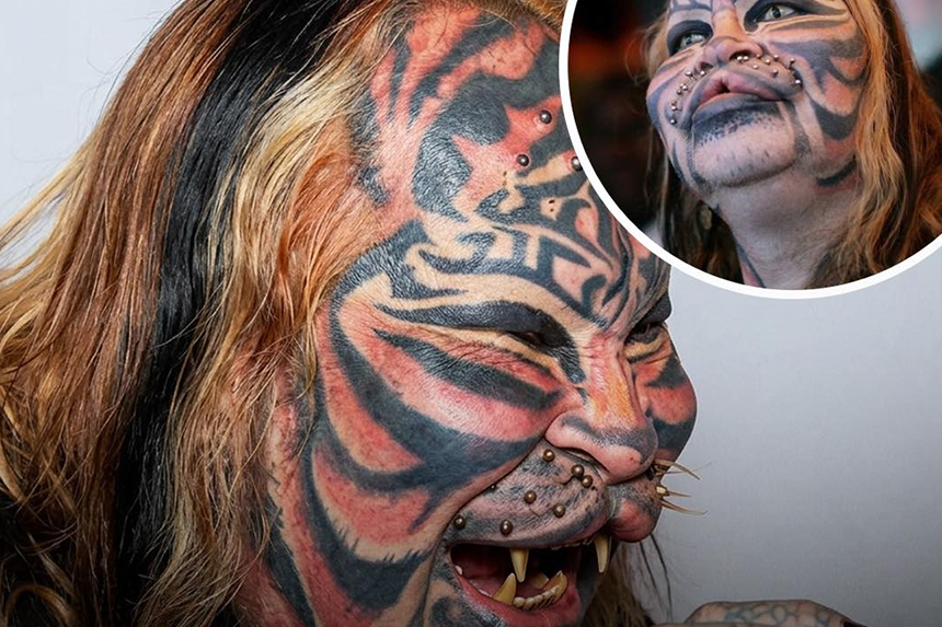 Ukiachilia mbali kugeuza sura, pia jamaa huyo amechora usoni Tatoo za mnyama huyo na kupandikiza meno makubwa ili analomaanisha liweze kuleta uhalisia.