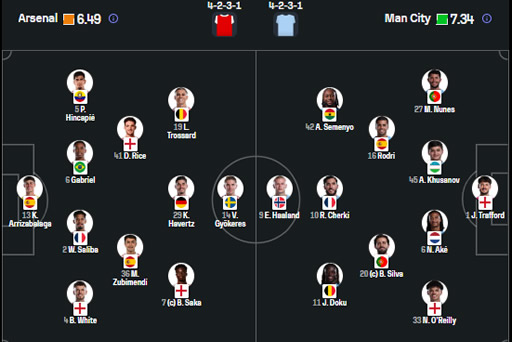 Kwenye mchezo huo City ili kutawala mchezo ilihakikisha inazuia kwa Arsenal kutoweza kumili mpira kwa asilimia kubwa ambapo ilianza kuzuia Arsenal kuanzia mbele kwa muundo wa 4-2-4 na kuwalazimisha mabeki wao kupiga mipira mirefu badala ya kupita njia za kati na pembeni, huku wakihakikisha hiyo mipira ya juu mabeki wao wanashinda mapambano ya juu.