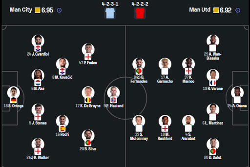 - Mstari wa kwanza wa uzuiaji wa United ulikuwa na watu wanne, kati Haaland & Cherki na pembeni Dorku & Semenyo huku nyuma tao kukiwa na viungo wawili Rodri na Bernado