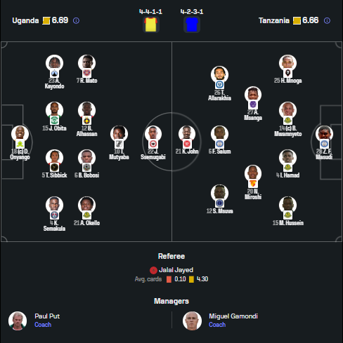 Stars walicheza na mfumo wa 4-2-3-1, ambapo wakizuia walinyumbulisha muundo wao na kuwa Mara chache walizuia kuanzia kwa presha kubwa kuanzia kwenye nusu ya Uganda wakiwa na muundo wa 4-1-4-1 na mara nyingi walizuia kwa presha ndogo wakiwa kwenye nusu yao muundo wa 4-4-2 dhidi ya muundo wa 3-2-5 (walionyumbulika kutoka mfumo wa 4-2-3-1) wa Uganda wanaoshambulia.